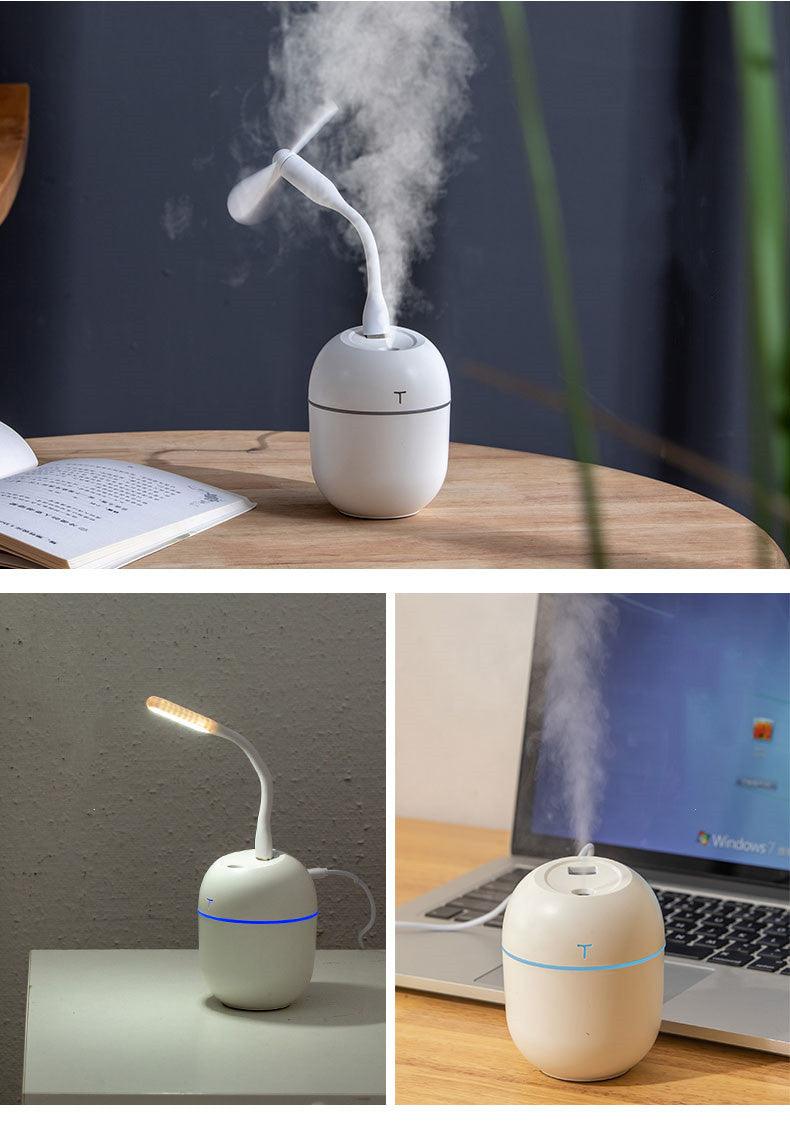 Possui luz de led, desligamento automático em caso de falta de água, alimentação por USB e funcionamento ultra sônico, formando uma névoa a partir da vibração da água sem a necessidade de produzir calor.